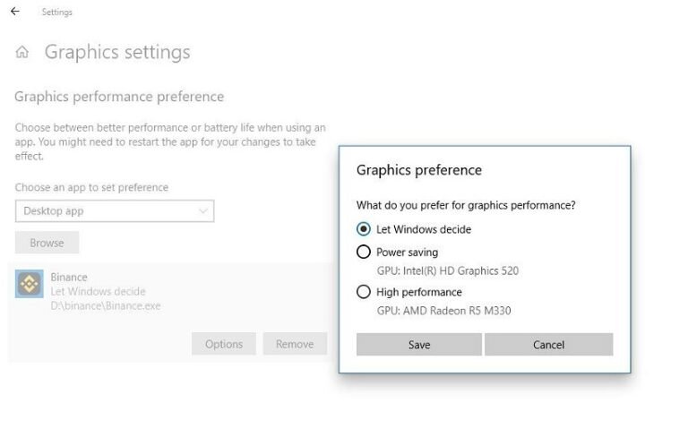 با استفاده از این مراحل توضیح داده شده، شما می‌توانید تنظیمات گرافیکی هر برنامه را تغییر دهید. همچنین در صورتی که برنامه‌ی مد نظر شما در این لیست قرار نداشت، می‌توانید آن را اضافه کنید. برای تغییر گرافیک در نظر گرفته شده‌ی هر برنامه روی گزینه‌ی Options کلیک کرده و اجازه دهید که خود ویندوز در مورد آن تصمیم بگیرد، در نهایت گزینه‌ی Save را بزنید.