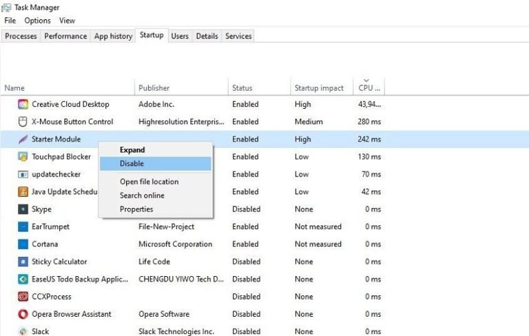 شما همچنین می‌توانید برنامه‌های موجود در لیست استارت آپ را از بخش Windows Task Manager غیرفعال کنید تا میزان مصرف منابع در هنگام شروع برنامه‌ها کمتر شود و این اقدام موجب می‌شود تا سیستم‌عامل ویندوز ۱۰ شما سریع‌تر بوت شود. برای آن دسته از کاربرانی که نمی‌دانند باید گفت برخی از برنامه‌ها وجود دارند که به محض روشن کردن سیستم به طور هم‌زمان با بالا آمدن ویندوز ۱۰ اجرا می‌شوند. شما می‌توانید پس ار بوت شدن ویندوز برخی از آن‌ها را مشاهده کنید که در حال اجرا هستند و در قسمت راست نوار پایینی ویندوز و در بخش آیکون‌ها به چشم می‌خورند. در بخش Windows Task Manager همه‌ی برنامه‌های موجود در لیست استارت آپ قابل مشاهده هستند که کاربران می‌توانند آن‌ها را غیرفعال کنند.