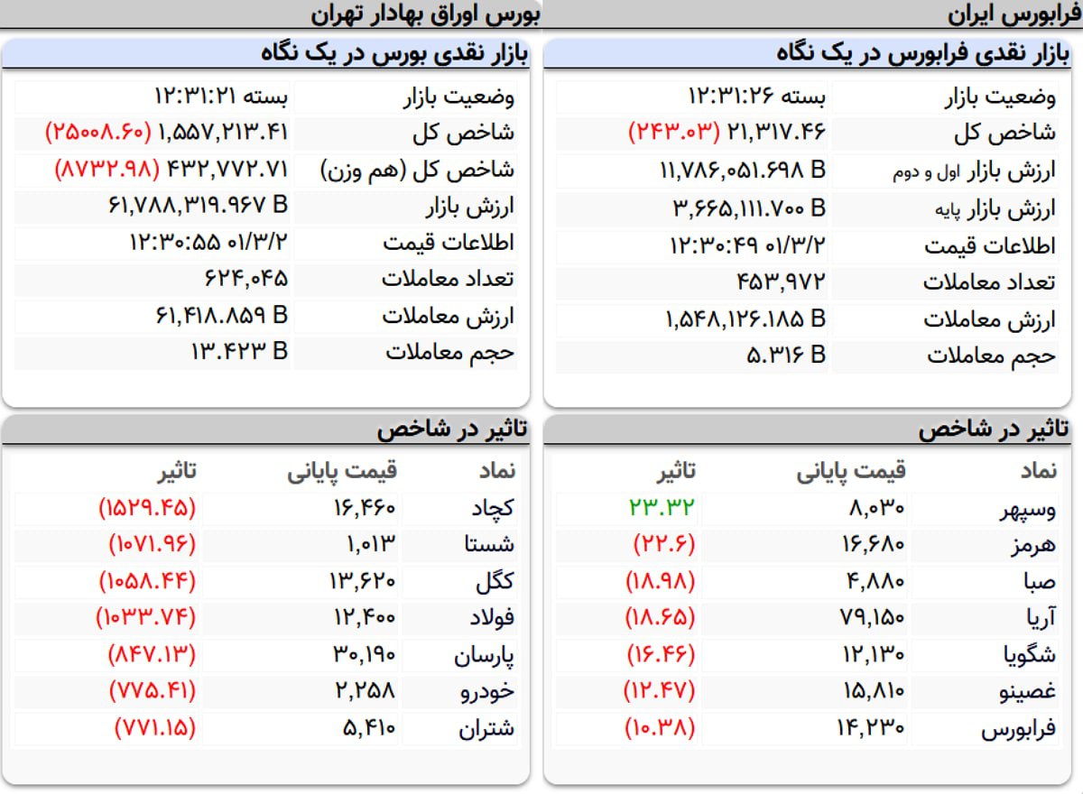 شاخص فرابورس نیز امروز بیش از ۲۴۳ واحد کاهش داشت و به ۲۱ هزار و ۳۱۷ واحد رسید.