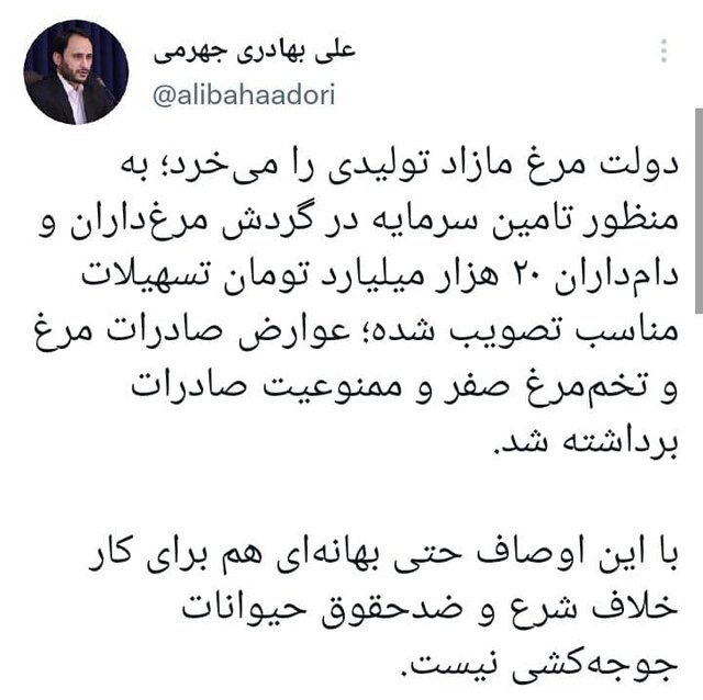 «دولت مرغ مازاد تولیدی را میخرد. به منظور تامین سرمایه در گردش مرغداران و دامداران ۲۰ هزار میلیارد تومان تسهیلات مناسب تصویب شده. عوارض صادرات مرغ و تخممرغ صفر و ممنوعیت صادرات برداشته شد.