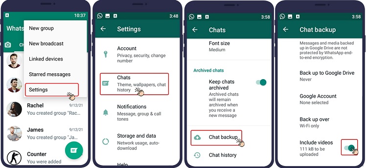 ۴- این صفحه تنظیمات بکاپ واتساپ است. آخرین گزینه Include videos است. با غیرفعال کردن این گزینه از ویدئوهای موجود در چت واتس اپ شما بک آپ گرفته نمیشود و در نتیجه دادههای استفاده شده برای بک آپ گیری از واتس اپ در گوشی شما کاهش مییابد.