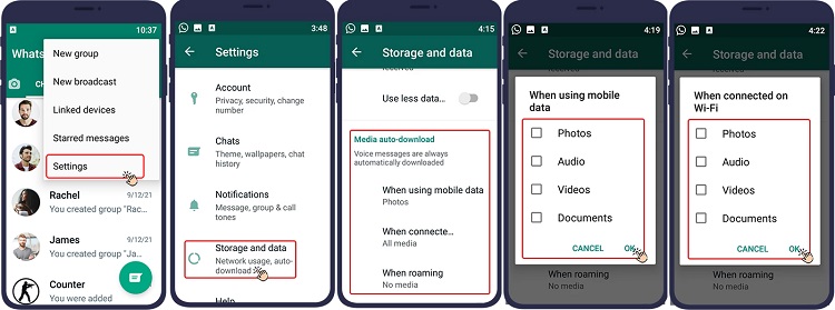 ۳- در قسمت دانلود خودکار رسانه سه گزینه را مشاهده خواهید کرد. هنگام استفاده از داده تلفن همراه، هنگامی که به وای فای متصل است و هنگام رومینگ. از گزینه اول میتوانید دانلود خودکار را هنگام استفاده از داده موبایل غیر فعال کنید. گزینه دوم دانلود خودکار را هنگام استفاده از وایفای غیر فعال میکند و گزینه سوم این قابلیت را در حالت رومینگ غیر فعال میکند. گزینه مورد نظر را انتخاب کرده و در پنجره ظاهر شده، کادر کنار مواردی را که نمیخواهید به طور خودکار دانلود شوند، علامت بزنید: عکسها، فایلهای صوتی، ویدیوها و اسناد. این کار را میتوانید برای هر سه حالت انجام دهید.