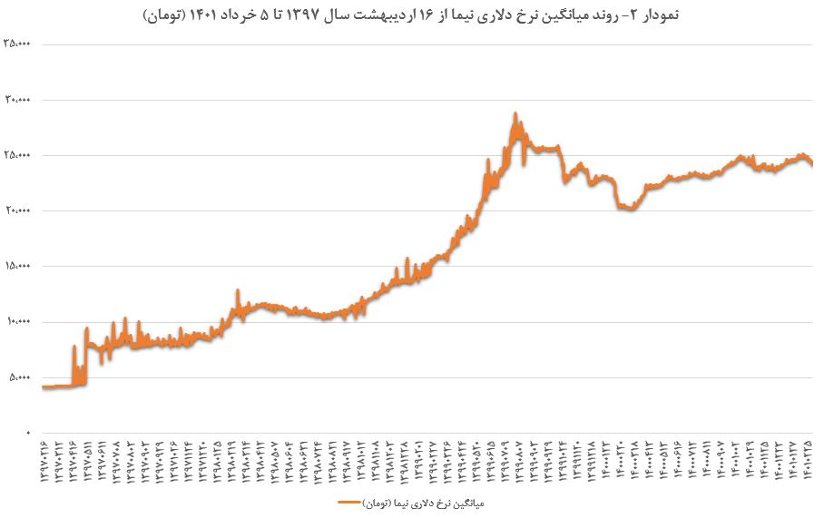 بررسی جداول آماری حاکی از این است که نرخ در بازار نیمایی در سال ۱۳۹۷ در قیمت پنج هزار تومان دادوستد می‌شد اما پس از روند افزایشی نرخ ارز در سال‌های گذشته، نرخ ارز نیمایی هم افزایش داشت به طوری که در آبان‌ماه ۹۹ به اوج خود یعنی نردیک ۳۰ هزار تومان رسید و شوک بزرگی را به بازار وارد کرد.