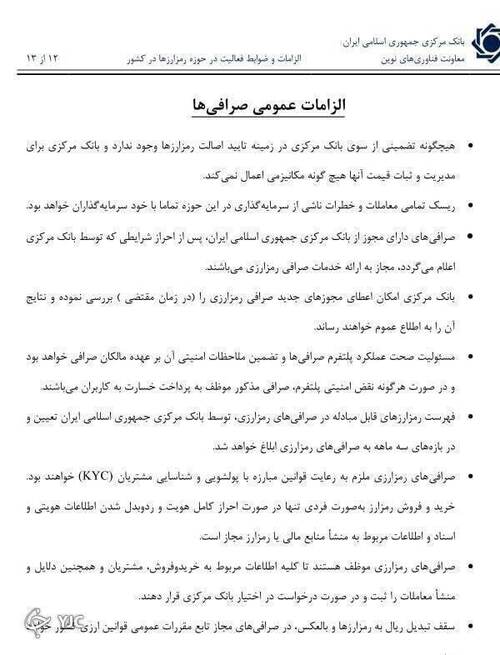 در سال ۹۶، بانک مرکزی طی بخشنامهای اعلام کرد که به علت عدم قانون گذاری در بازار رمزارزها، این بانک مسئولیت نظارتی در این خصوص ندارد.