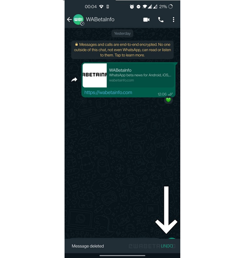 این شرکت همچنین در حال کار بر روی گزینه لغو برای چتهای حذف شده است. در صورتی که شما به طور تصادفی پیامی را ارسال کرده باشید و به جای گزینه delete for every روی گزینه delete for me کلیک کرده باشید، این قابلیت مفیدی خواهد بود. اسکرین شات به اشتراک گذاشته شده از این ویژگی توسط WABetainfo نشان میدهد که پس از پاک کردن آخرین پیام، فرستنده یک دکمه مشاهده خواهد کرد که میتواند با استفاده از آن حذف را لغو کند.