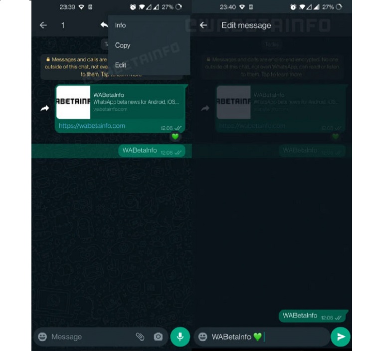 فرارو نوشت، ویژگی ویرایش متن واتساپ اولین بار توسط WABetaInfo مشاهده شده است. همانطور که از نام آن پیداست، این ویژگی به کاربران اجازه میدهد پیامهای متنی را ویرایش کنند. آنها باید روی یک پیام ضربه بزنند و نگه دارند، نماد سه نقطه در بالا را انتخاب کنند و گزینه ویرایش را انتخاب کنند.