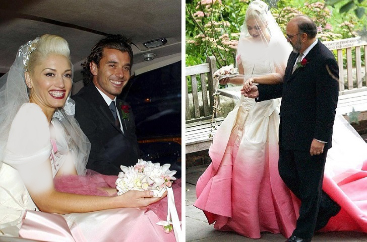 لباسی که گوئن استفانی در عروسی سال ۲۰۰۲ خود به تن کرده بود در بالاتنه یک لباس عروسی کاملاً معمولی و متعارف بود. اما دامن لباس اصلاً متعارف نبود چون رنگی صورتی داشت که هر چه به سمت پایین می رفت پررنگ تر می شد. پایین توری که این خواننده به سر گذاشته بود هم مانند دامن صورتی بود.