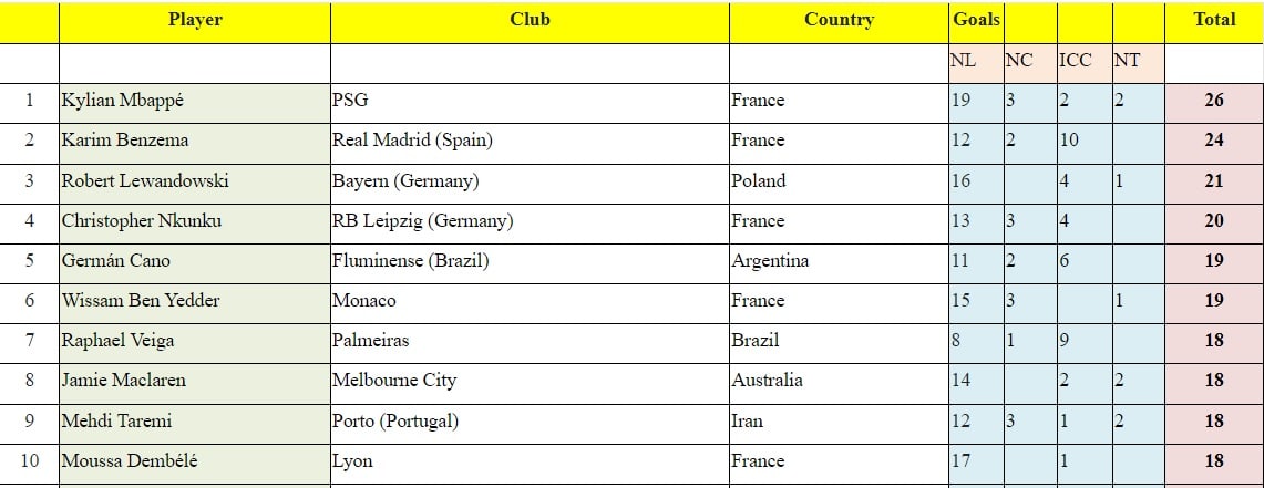 در این ردهبندی که بر اساس شمارش همه گلهای زده بازیکنان در سطح بزرگسالان(ملی و باشگاهی) صورت گرفته، روبرت لواندوفسکی ستاره لهستانی بایرن مونیخ با ۲۱ گل زده در رده سوم قرار دارد و کریستوفر انکوکو بازیکن فرانسوی لایپزیک با ۲۰ گل در رده چهارم حضور دارد. ژرمن کانو بازیکن آرژانتینی فلومیننزه برزیل و ویسام بنیدر مهاجم فرانسوی موناکو با ۱۹ گل زده پنجم و ششم هستند. رافائلویگا بازیکن برزیلی پالمیراس، جیمی مک لارن بازیکن استرالیایی ملبورن سیتی و همچنین مهدی طارمی مهاجم ایرانی پورتو نیز هرکدام ۱۸ گل زده دارند و رده های هفتم و هشتم و نهم را به خود اختصاص دادند. همچنین موسی دمبله بازیکن فرانسوی لیون هم در رده دهم قرار گرفته است.