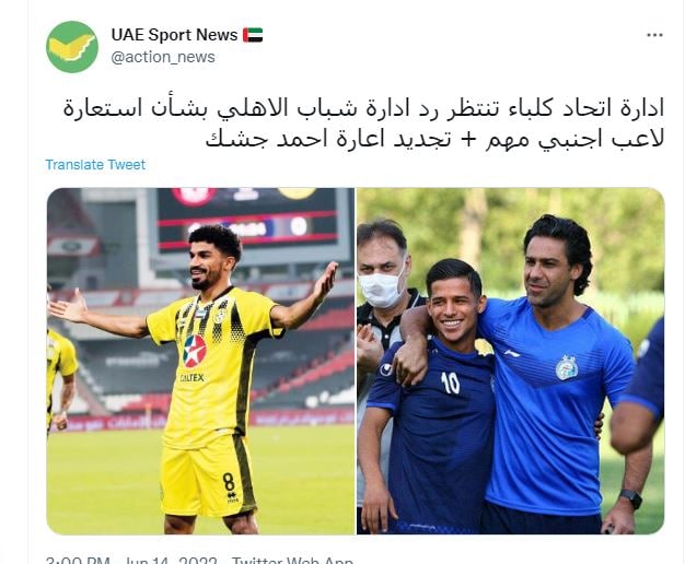 این رسانه اماراتی با انتشار تصویری مجیدی در کنار قائدی در زمان حضورشان در استقلال نوشت: باشگاه اتحاد کلباء منتظر پاسخ باشگاه شباب الاهلی برای جذب قرضی یک بازیکن خارجی مهم این تیم است. همچنین اتحاد کلباء می خواهد قرارداد قرضی جشک را تمدید کند.