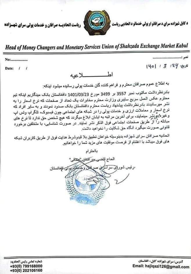 طالبان در اطلاعیه اعلام نرخ ارز را ممنوع کرد. هیچ شخصی حق ندارد تا نرخ های مبادله ای را از طریق شبکه های اجتماعی نشر نماید.