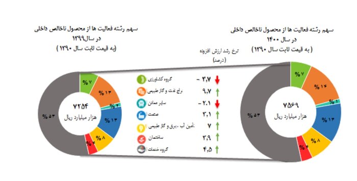 براساس این گزارش، در سال ١٤٠٠ رشته فعالیتهای گروه کشاورزی منفی ٣,٧، گروه صنایع و معادن مثبت ۶ و گروه خدمات هم مثبت ۴٫۵ درصد نسبت به دوره مشابه سال قبل، رشد داشته است.
