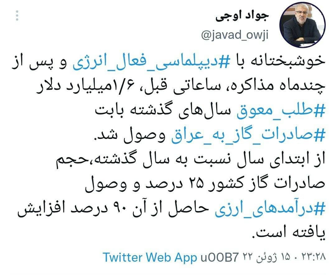 به گزارش سایت طلا،آقای جواد اوجی در توئیتی نوشت: با دیپلماسی فعال انرژی و پس از چندماه مذاکره، ساعاتی قبل، ۱.۶میلیارد دلار طلب معوق سالهای گذشته بابت صادرات گاز به عراق وصول شد.