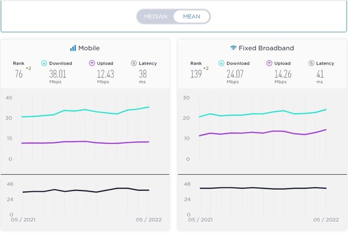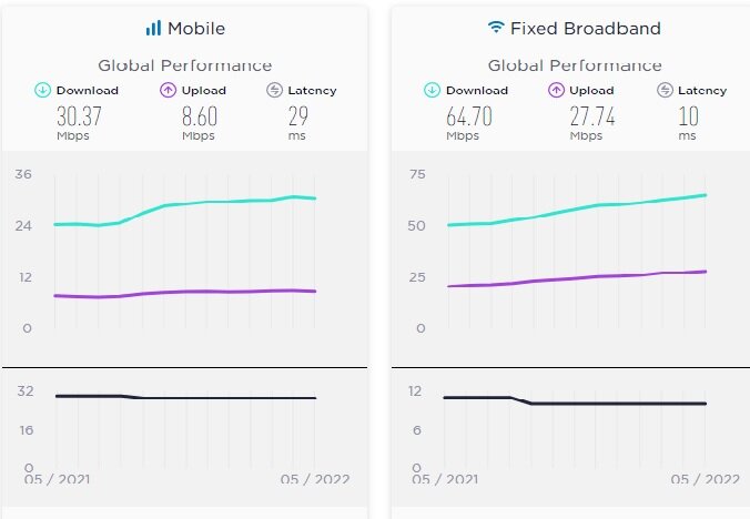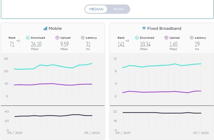 میانگین سرعت دانلود اینترنت سیار بر اساس این شاخص، ۳۸.۰۱ مگابیت بر ثانیه، سرعت آپلود ۱۲.۴۳ مگابیت بر ثانیه و میزان تاخیر ۳۸ ملی‌ثانیه است. در اینترنت ثابت، سرعت دانلود ۲۴.۰۷ مگابیت بر ثانیه، سرعت آپلود ۱۴.۲۶ مگابیت بر ثانیه و میزان تاخیر ۴۱ میلی‌ثانیه است.