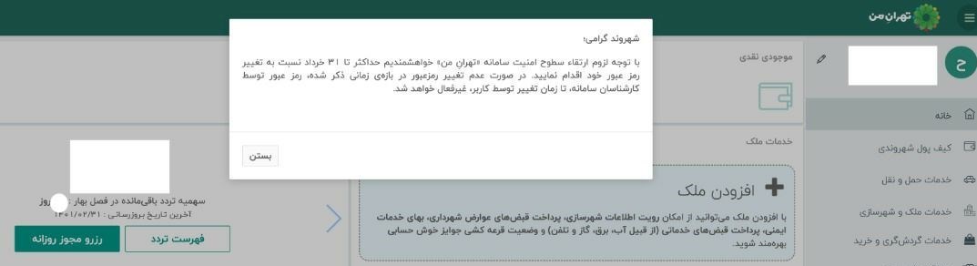 کاربران تهران من تا ۳۱ خرداد رمز ورود خود را تغییر دهند