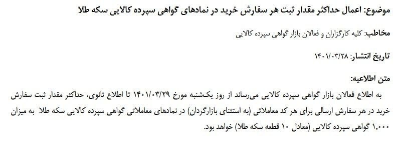 به گزارش سایت طلا، به اطلاع فعالان بازار گواهی سپرده کالایی می رساند از روز یکشنبه 1401/03/29 تا اطلاع ثانوی حداکثر مقدار ثبت سفارش خرید در هر سفارش ارسالی برای هر کد معاملاتی (به استثنای بازار گردان ) در نمادهای معاملاتی گواهی سپرده کالایی سکه طلا به میزان ۱۰۰۰ گواهی سپرده کالایی (معادل ۱۰ قطعه سکه طلا )خواهد بود.