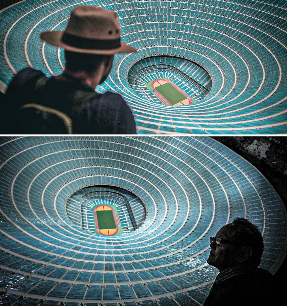 این استادیوم که توسط یک آمریکایی طراحی شده می تواند یک میلیون هوادار را در خود جای دهد. مستطیل سبز این ورزشگاه به اندازه یک تلفن همراه از دور دیده می شود.