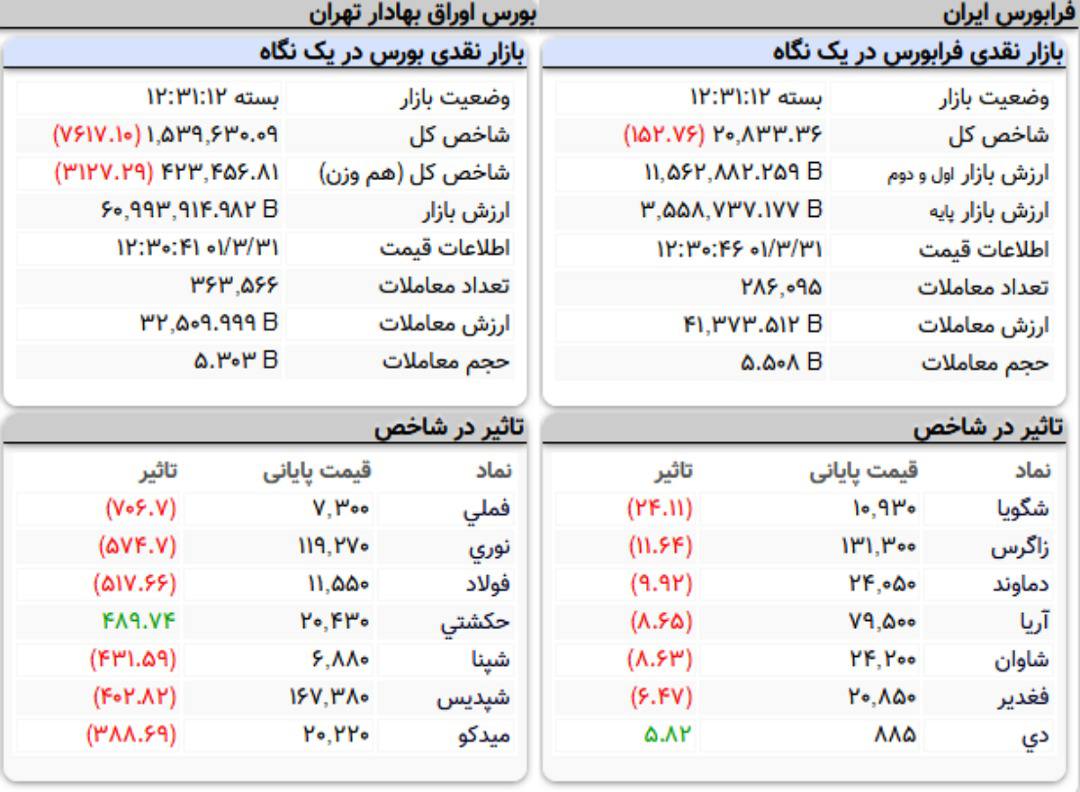 همچنین پتروشیمی تندگویان (شگویا)، پتروشیمی زاگرس (زاگرس)، تولید نیروی برق دماوند (دماوند)، پلیمر آریا ساسول (آریا)، پالایش نفت لاوان (شاوان) و آهن و فولاد غدیر ایرانیان (فغدیر) تاثیر منفی بر شاخص فرابورس داشتند.