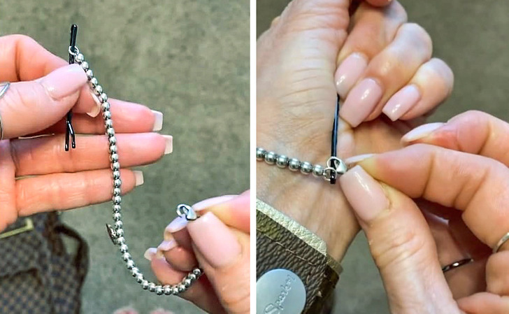 یک راه آسان و سریع برای بستن دستبند، استفاده از سنجاق سر است. پین را از طریق گیره رد کنید و آن را در دست خود نگه دارید. به این ترتیب میتوانید انتهای آزاد دستبند را که معمولاً آویزان میشود و از مچ میافتد، بگیرید و آن را بدون هیچ مشکلی ببندید.