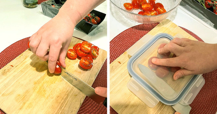 گوجه گیلاسی کوچک است و به سختی برش می خورد. برای آسانتر کردن این فرآیند، گوجهفرنگیها را زیر در ظرف قرار دهید و آن را با دست فشار دهید. با دست دیگرتان یک چاقو بردارید، آن را به موازات درب ظرف نگه دارید و گوجه فرنگی ها را برش دهید.