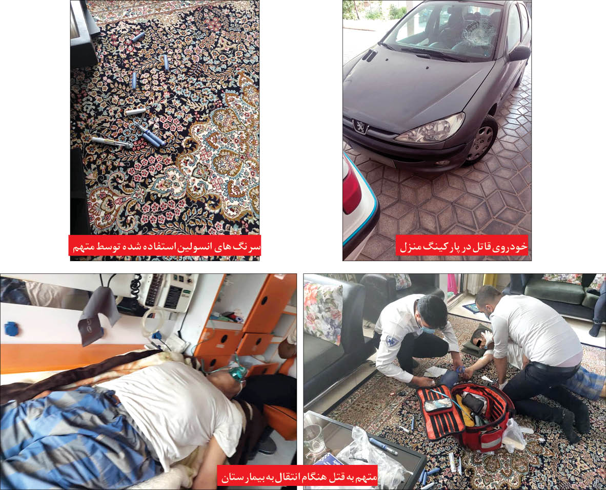 هنگامی که گروه تخصصی پروندههای جنایی وارد پذیرایی شدند ناگهان مرد ۶۲ ساله را بیهوش یافتند که به صورت دمر کف پذیرایی افتاده بود و سرنگهای تزریق انسولین زیادی نیز در کنار وی دیده میشد.