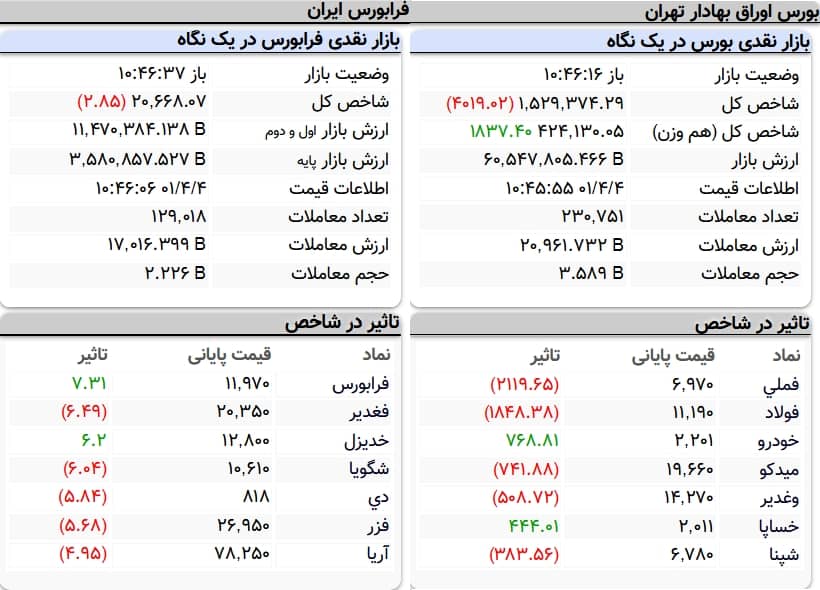 در این بازار هم امروز بیشترین اثر منفی بر شاخص فرابورس به نام نمادهای معاملاتی آهن و فولاد غدیر ایرانیان، پلیمر آریا ساسول و پتروشییم تندگویان شد و در مقابل شرکتهای فرابورس ایران، بهمن دیزل و بیمه کوثر بیشترین اثر مثبت را بر این شاخص به نام خود ثبت کردند.