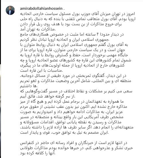 "حسین امیرعبداللهیان"، وزیر امور خارجه کشورمان در صفحه شخصی اینستاگرام خود نتایج گفتوگو با "جوزپ بورل"، نماینده عالی سیاست خارجی اتحادیه اروپا را مثبت ارزیابی کرد.