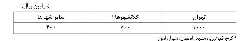 بانک مرکزی در بخشنامه ای به شبکه بانکی، سقف تسهیلات کمک ودیعه مسکن را برای مشمولان در تهران ۱۰۰۰ میلیون ریال، کلانشهر ها ۷۰۰ میلیون ریال و سایر شهرها ۴۰۰ میلیون ریال ابلاغ کرد.