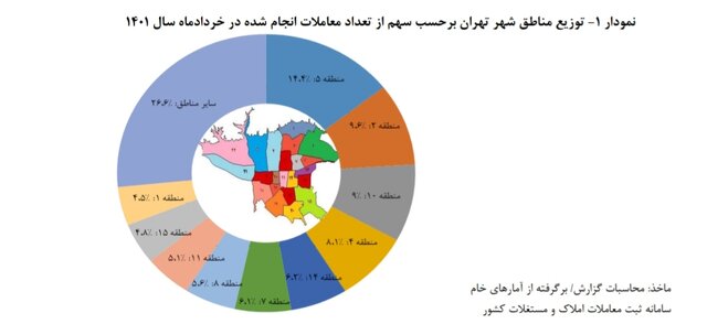 همچنین، توزیع معاملات انجام شده مسکن بر اساس مناطق شهری در تهران حاکی از آن است که منطقه ۵ با ۱۴.۴ درصد از کل معاملات، بیشترین سهم معاملات شهر تهران را به خود اختصاص داده است.