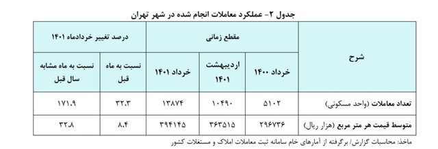 علاوه بر این، تعداد معاملات انجام شده در این ماه حدود ۱۳.۹ هزار فقره بود که نسبت به ماه قبل و ماه مشابه در سال ۱۴۰۰ معادل ۳۲.۳ و ۱۷۱.۹ درصد افزایش را نشان میدهد و بررسی توزیع تعداد واحدهای مسکونی معامله شده در شهر تهران به تفکیک عمر بنا حاکی از آن است که واحدهای تا پنج سال ساخت با سهم ۳۰.۱ درصد بیشترین سهم را به خود اختصاص دادهاند.