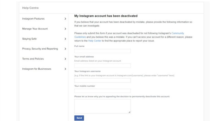 یکی از سادهترین روشها برای بازیابی اکانت غیرفعال شده اینستاگرام، ارسال درخواست تجدیدنظر به اینستاگرام با جزئیات است. توجه داشته باشید که فقط تا ۳۰ روز از روزی که حساب شما غیرفعال شده است، میتوانید این درخواست تجدید نظر را ارسال کنید. پس از ۳۰ روز، حساب شما برای همیشه حذف خواهد شد و معمولاً فقط در صورتی میتوانید حساب خود را بازیابی کنید که به اشتباه غیرفعال شده باشد. به منظور سرعت بخشیدن به این کار، میتوانید در ۳ فرمت مختلف درخواست تجدید نظر کنید که دو فرمت آن ارسال فرم و دیگری از طریق ارسال ایمیل به پشتیبانی اینستاگرام است.