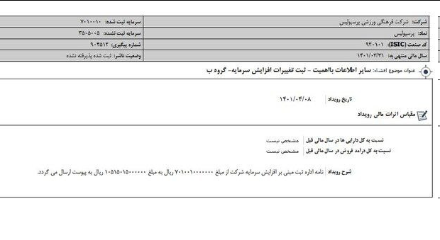 شرکت فرهنگی - ورزشی پرسپولیس که برای ورود به تالار بورس کشور نیاز به شفاف سازی مالی است در آخرین آگهی که در سامانه «کدال» به تاریخ هشتم تیرماه ۱۴۰۱ ثبت گردید افزایش سرمایه داشت تا میزان آن به ۱۰ هزار و ۵۱۵ میلیارد و ۱۵ میلیون ریال برسد.