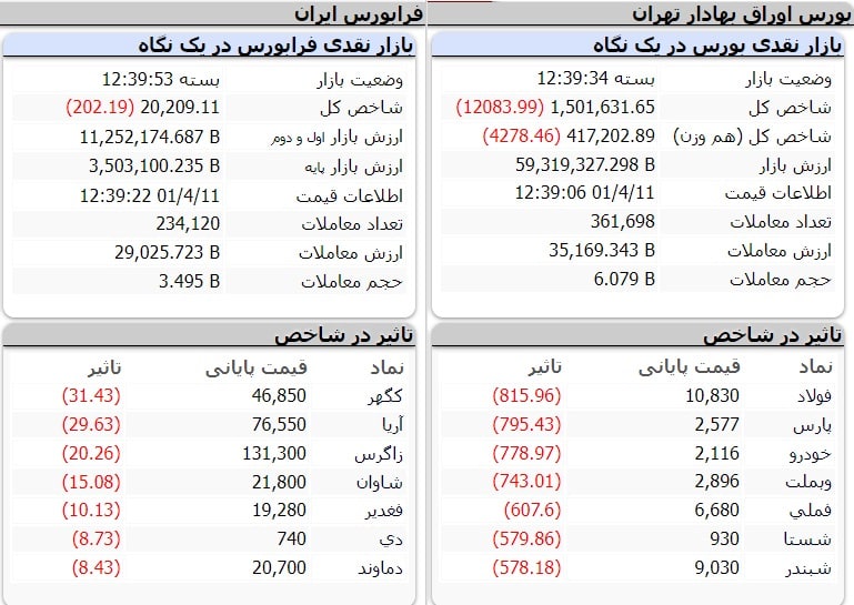 به گزارش سایت طلا،در معاملات امروز شاخص کل بورس ۱۲ هزار و ۸۳ واحد کاهش یافت و در رقم یک میلیون و ۵۰۱ هزار واحد ایستاد. شاخص کل با معیار هم وزن هم با ۴۲۷۸ واحد کاهش رقم ۴۱۷ هزار و ۲۰۲ واحد را ثبت کرد. در این بازار ۳۶۲ هزار معامله به ارزش ۳۷ هزار و ۹۲۹ میلیارد ریال انجام شد.