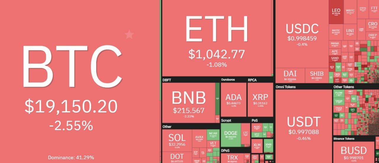 بیتکوین با افت حدود ۲ درصد به قیمت ۱۹ هزار و ۱۵۰ دلار و اتریوم با کاهش بیش از ۱ درصد به قیمت هزار و ۴۲ دلار معامله میشوند.