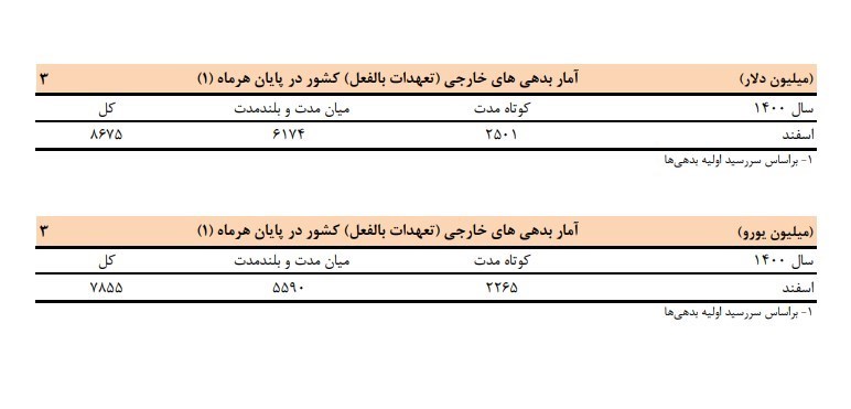 طبق این گزارش، معادل یورویی بدهی خارجی ایران نیز در تاریخ مورد بررسی، حدود 7.8 میلیارد یورو است که 5.5 میلیارد یورو از این میزان، حجم بدهیهای میان مدت و بلندمدت بوده و 2.2 میلیون یورو حجم بدهیهای کوتاه مدت است.