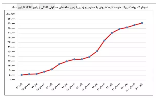 بر اساس گزارش مرکز آمار از وضعیت مسکن در تهران، متوسط قیمت هر متر مربع واحد مسکونی در پایتخت از پاییز ۱۳۹۶ تا پاییز ۱۴۰۰ رشد ۵۷۰ درصدی داشته است.