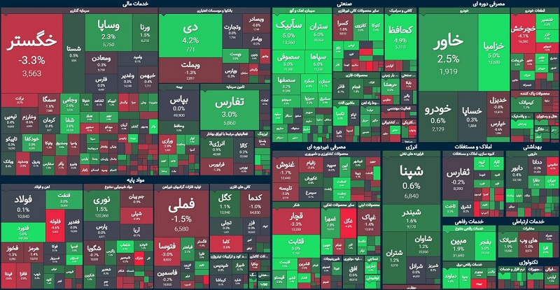 امروز نمادهای پتروشیمی خلیجفارس، فجر انرژی خلیجفارس، پتروشیمی نوری، پالایش نفت بندرعباس و صنعتی گلگهر بیشترین اثر افزایشی در شاخص بورس را داشتند و برعکس، نمادهای ملیمس و بانک ملت بیشترین اثر کاهشی در شاخص بورس را از خود به جای گذاشتند.
