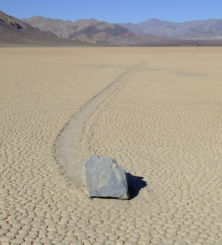 در مناطقی مثل ریسترک پلایا در دره مرگ کالیفرنیا برخی از سنگها در کف این دریاچه خشک شده راه میروند. این سنگها که به سنگهای روان معروف هستند، با زنجیرهای از اتفاقات نادر رخ میدهند. زمانی که باران میبارد، حوضچههای بزرگ و زودگذری تشکیل میدهد که در طول شب یخ میزنند و لایههای بزرگ و نازکی از یخ به وجود میآورد. این لایههای یخی با آفتاب ظهر آب میشوند و به کمک باد آرامی که میوزد، سنگها را به حرکت در میآورد و ردی از حرکت آنها روی زمین به جا میگذارد.