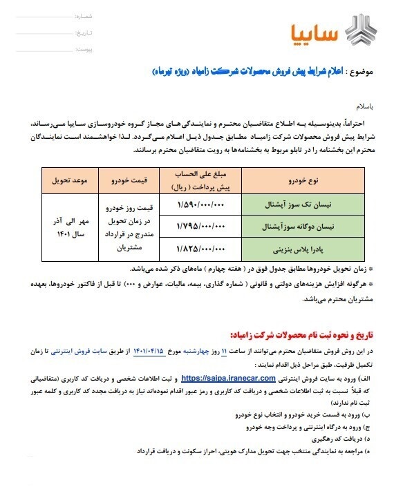 گروه خودروسازی سایپا شرایط پیش فروش محصولات شرکت زامیاد را اعلام کرد.