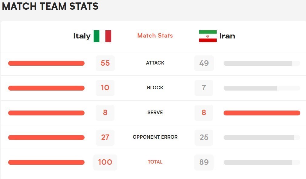 تیم ایران دومین مسابقه خود در هفته سوم لیگ ملتها 2022 را با ترکیب میلاد عبادیپور، امیرحسین اسفندیار، مهدی جلوه، محمدطاهر وادی، امین اسماعیلنژاد، امیرحسین توخته و محمدرضا حضرتپور برابر ایتالیا آغاز کرد.