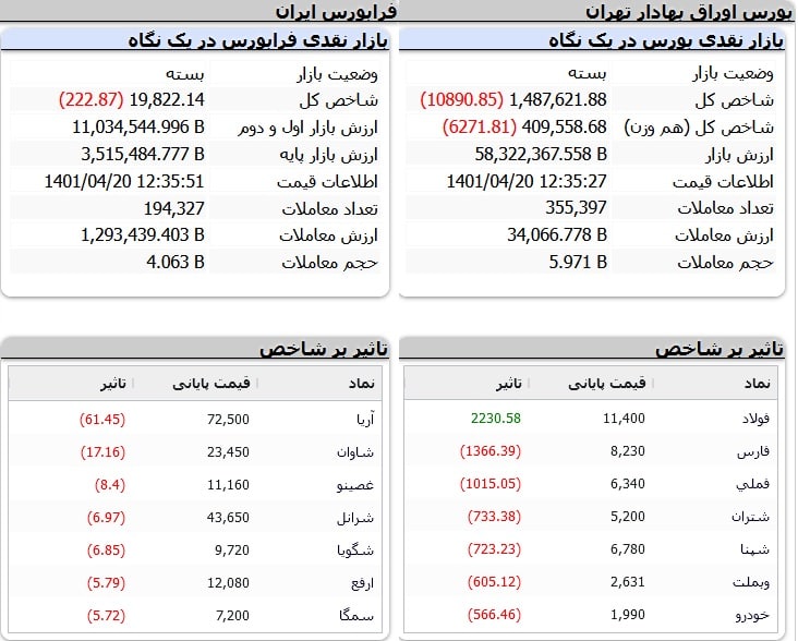 شاخص کل فرابورس امروز با ۲۲۲ واحد کاهش به کانال ۱۹ هزار واحد عقبگرد کرد و در رقم ۱۹ هزار و ۸۲۲ واحد ایستاد. معاملهگران این بازار ۱۹۴ هزار معامله به ارزش ۱۲۹۳ میلیارد ریال انجام دادند. پلیمر آریاساسول، پالایش نفت لاوان، صنعتی مینو، نفت ایرانول، پتروشیمی تندگویان، شرکت آهن و فولاد ارفع و گروه سرمایه گذاری میراث فرهنگی نسبت به سایر نمادها بیشترین تاثیر منفی را روی فرابورس گذاشتند.