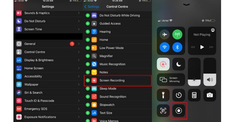 ۱- ابتدا به Control Centre آیفون بروید و سپس روی نماد " +" در کنار گزینه Screen Recording ضربه بزنید.