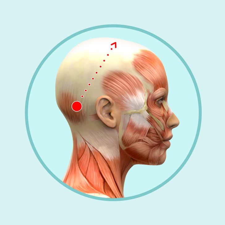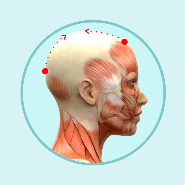 انگشتان هر دو دست را روی پیشانی، روی خط مو قرار دهید، و با فشار دادن و حرکات دایرهوار به سمت بالا حرکت کنید. به نواحی که در آن درد دارید، بیشتر توجه کنید.