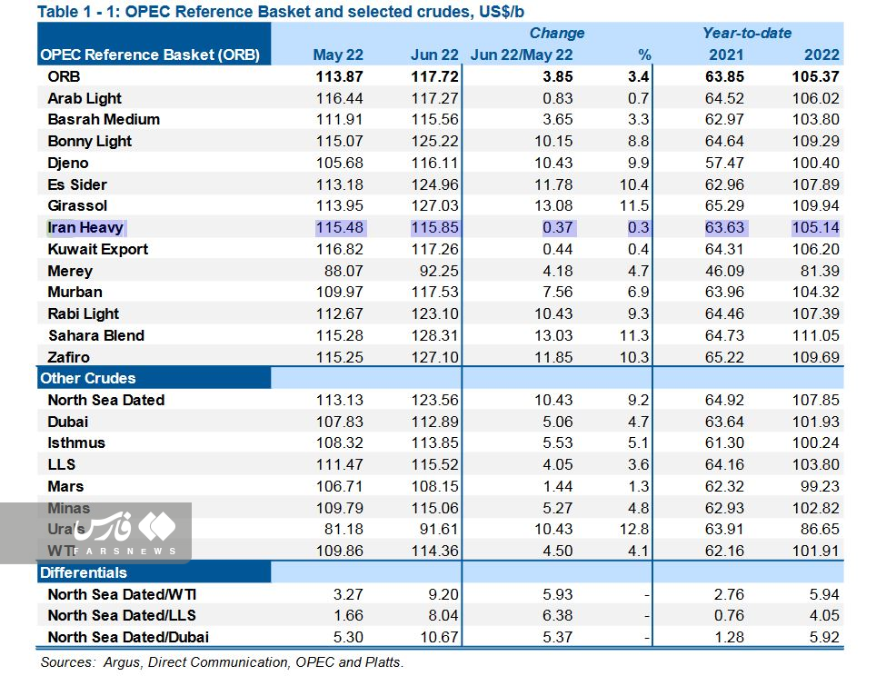 اوپک در جدیدترین گزارش خود اعلام کرد: متوسط قیمت هر بشکه نفت سنگین ایران در ماه ژوئن ۲۰۲۲ (خرداد 1401) به 115.85 دلار رسیده و متوسط قیمت نفت ایران در 6 ماه نخست امسال بیش از 41 دلار افزایش داشته است.