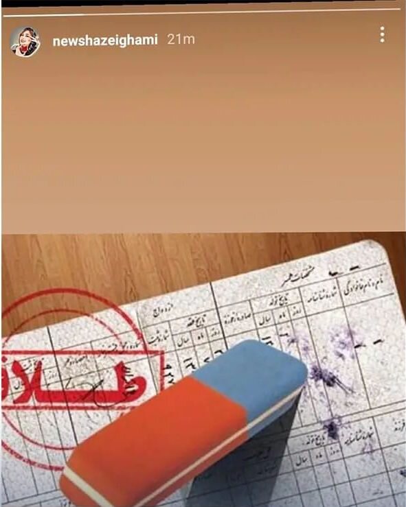 نیوشا ضیغمی عکسی از شناسنامه‌ای که مهر طلاق دارد را منتشر کرد. او استوری خود را بعد از ساعاتی حذف کرد که همین موضوع سبب دوگانی درباره خبرهای جدایی نیوشا ضیغمی از همسرش شده است.