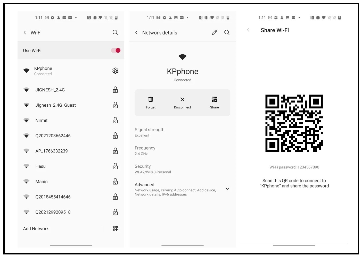 در اندروید ۱۰ و بالاتر میتوان رمز وای فای یک شبکه متصل را در منوی اشتراک گذاری آشکار کرد. این برای همه OEMهایی که از اندروید استوک (نسخه پیش فرض سیستم عامل اندروید) استفاده میکنند صدق میکند. در برنامه تنظیمات به بخش "Wi-Fi" بروید. شبکه متصل را انتخاب کرده و سپس روی دکمه اشتراکگذاری ضربه بزنید. پس از این کار یک کد QR برای اتصال به شبکه ظاهر میشود. رمز عبور وای فای در زیر کد به صورت متن ساده نوشته شده است.