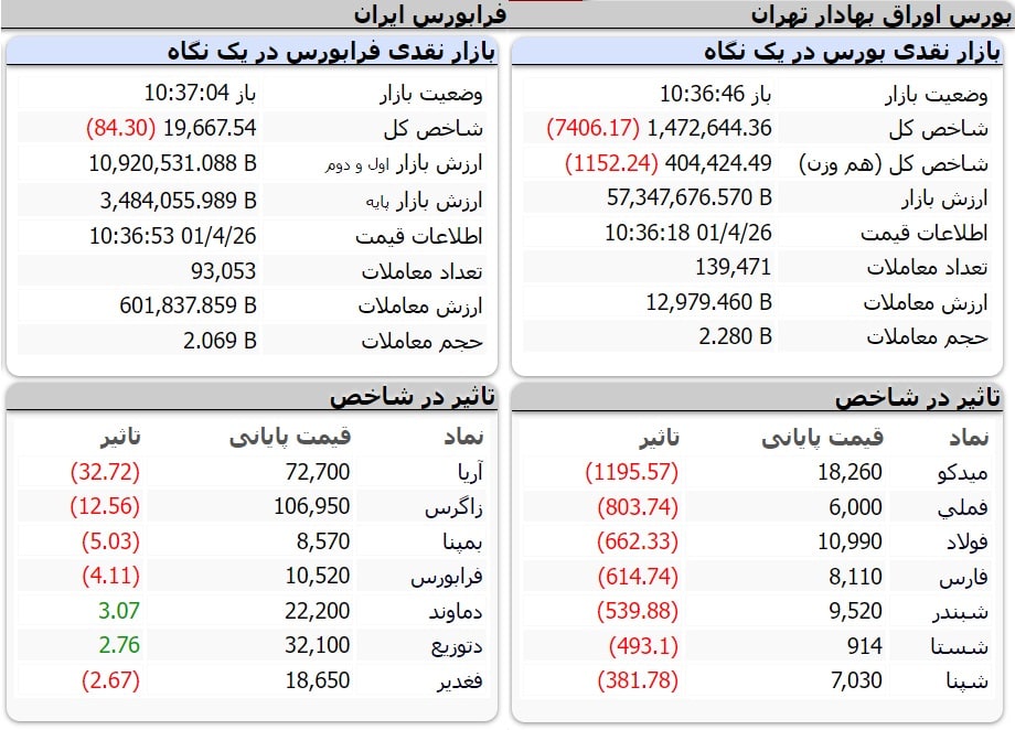 در این بازار هم امروز بیشترین اثر منفی بر شاخص فرابورس به نام نمادهای معاملاتی پلیمر آریا ساسول، پتروشیمی زاگرس و فولاد هرمزگان جنوب و بیشترین اثر مثبت بر این نماگر به نام بهمن دیزل، توریع دارو پخش و تولید نیروی برق دماوند شد.
