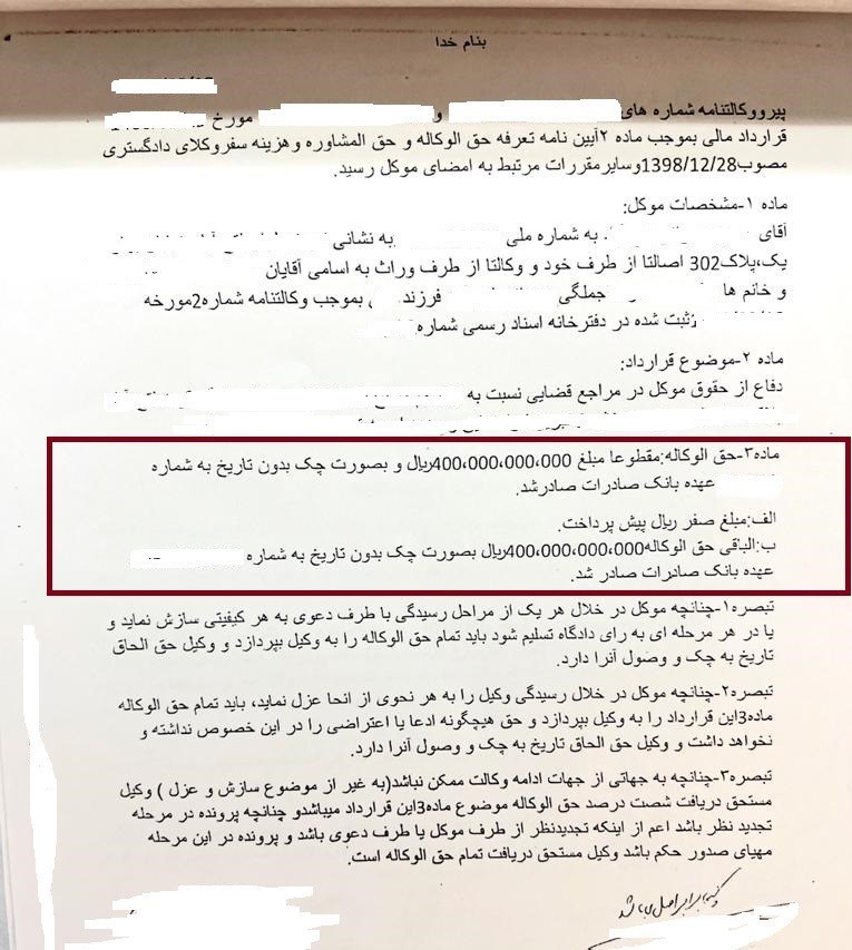 حقالوکاله ۴۰۰ میلیاردی وکیل برای یک پرونده! + تصویر قرارداد