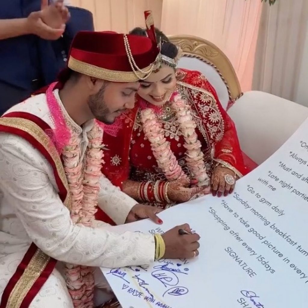 سایر الزامات قرارداد شامل گرفتن عکس خوب در هر مهمانی، خرید بعد از هر ۱۵ روز و مهمانی دیرهنگام اما فقط با یکدیگر بود. این زوج در ۹ ژوئن در آسام هند ازدواج کردند. آنها امضاهای خود را روی یک مقوای بزرگ زدند که بالای آن عبارت «قرارداد» نوشته شده بود. گفته می شود که عروس شرایط عقد را تنظیم کرده است اما در نهایت هر دو به توافق رسیدند.
