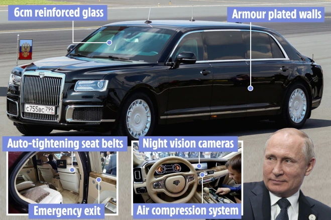 به گزارش سایت طلا، خودروی رئیس جمهور روسیه معمولاً توسط موتورسیکلت‌های Ural یا BMW اسکورت می‌شود. این خودرو زرهی هفت تن وزن دارد و می‌تواند در برابر بمب و تسلیحات شیمیایی مقاومت کند.