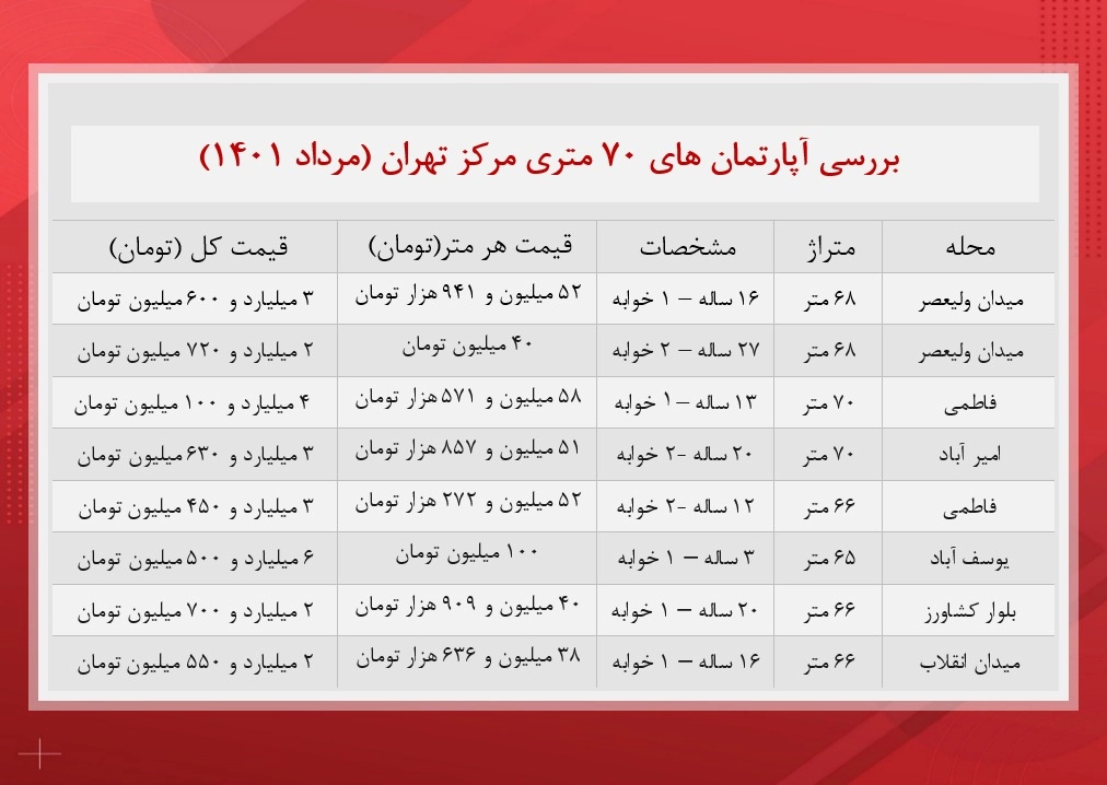 در گزارش زیر به بررسی قیمت و مشخصات آپارتمانهای ۷۰ متری مرکز تهران خواهیم پرداخت.